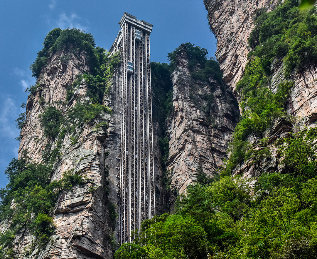 百龙天梯是世界自然遗产核心区——武陵源风景名胜区的全新交通体验载体,垂直高差335米,运行高度326米,每小时运载量逾5,500人次,被誉为“世界上最高、运行速度最快、载重量最大的电梯”,并载入吉尼斯世界纪录。